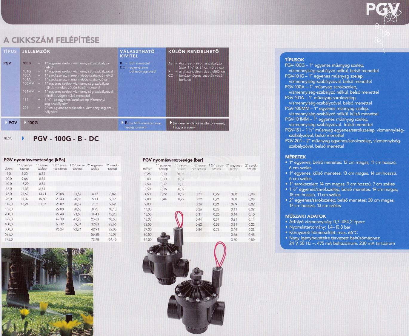 TÍPUSOK PGV-100G – 1” egyenes műanyag szelep,  vízmennyiség-szabályzó nélkül, belső menettel PGV-101G – 1” egyenes műanyag szelep,  vízmennyiség-szabályzóval, belső menettel PGV-100A – 1” műanyag sarokszelep,  vízmennyiség-szabályzó nélkül, belső menettel PGV-101A – 1” műanyag sarokszelep,  vízmennyiség-szabályzóval, belső menettel PGV-100MM – 1” egyenes műanyag szelep,  vízmennyiség-szabályzó nélkül, külső menettel PGV-101MM – 1” egyenes műanyag szelep,  vízmennyiség-szabályzóval,  külső menettel PGV-151 – 1 ½” műanyag egyenes/sarokszelep, vízmennyiségszabályzóval, belső menettel PGV-201 – 2” műanyag egyenes/sarokszelep, vízmennyiségszabályzóval, belső menettel