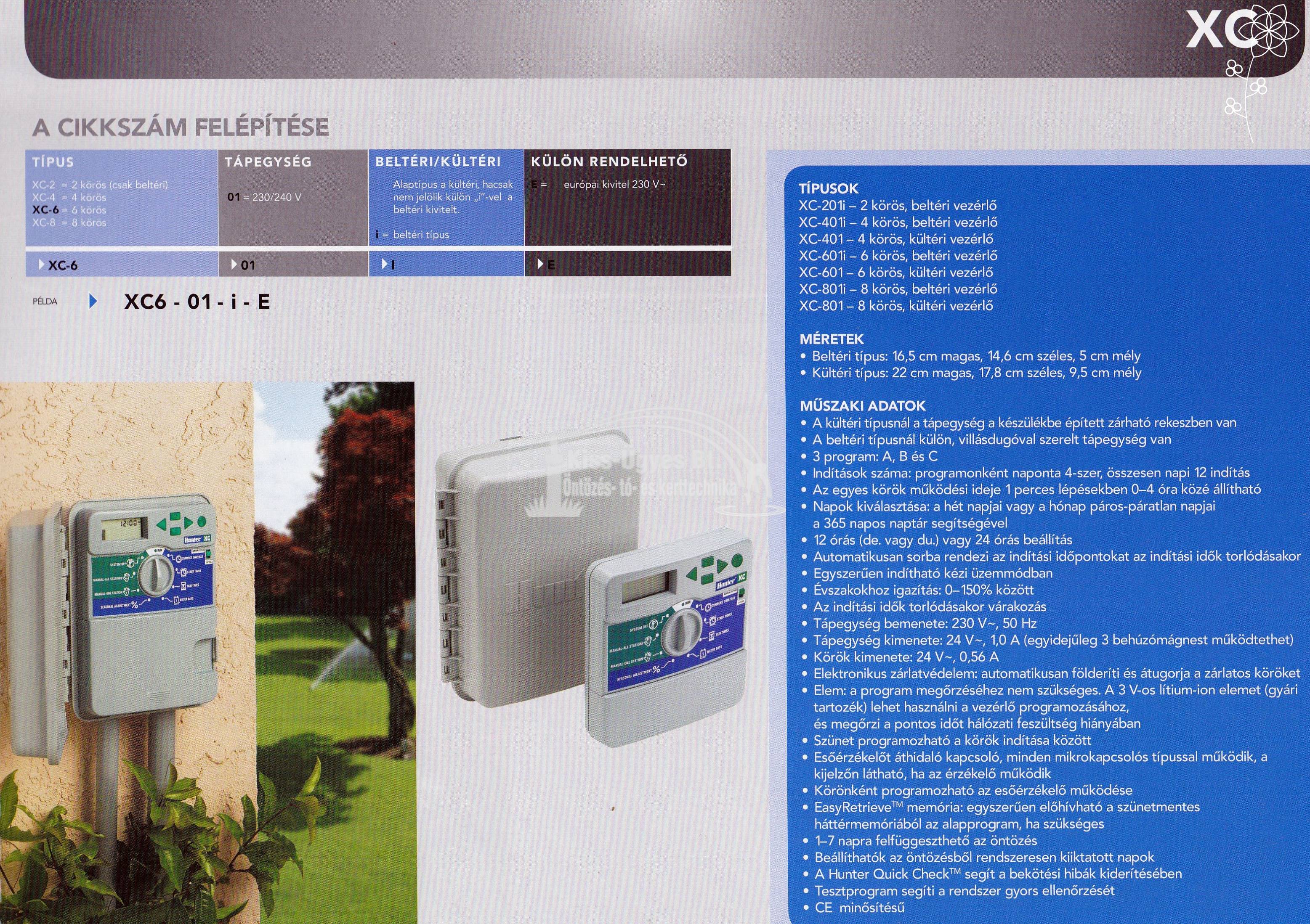 MŰSZAKI ADATOK • A kültéri típusnál a tápegység a készülékbe épített zárható rekeszben van • A beltéri típusnál külön, villásdugóval szerelt tápegység van • 3 program: A, B és C • Indítások száma: programonként naponta 4-szer, összesen napi 12 indítás • Az egyes körök működési ideje 1 perces lépésekben 0–4 óra közé állítható • Napok kiválasztása: a hét napjai vagy a hónap páros-páratlan napjai  a 365 napos naptár segítségével • 12 órás (de. vagy du.) vagy 24 órás beállítás • Automatikusan sorba rendezi az indítási időpontokat az indítási idők torlódásakor • Egyszerűen indítható kézi üzemmódban • Évszakokhoz igazítás: 0–150% között • Az indítási idők torlódásakor várakozás • Tápegység bemenete: 230 V~, 50 Hz • Tápegység kimenete: 24 V~, 1,0 A (egyidejűleg 3 behúzómágnest működtethet) • Körök kimenete: 24 V~, 0,56 A • Elektronikus zárlatvédelem: automatikusan földeríti és átugorja a zárlatos köröket • Elem: a program megőrzéséhez nem szükséges. A 3 V-os lítium-ion elemet (gyári tartozék) lehet használni a vezérlő programozásához,  és megőrzi a pontos időt hálózati feszültség hiányában • Szünet programozható a körök indítása között • Esőérzékelőt áthidaló kapcsoló, minden mikrokapcsolós típussal működik, a kijelzőn látható, ha az érzékelő működik • Körönként programozható az esőérzékelő működése • EasyRetrieveTM memória: egyszerűen előhívható a szünetmentes háttérmemóriából az alapprogram, ha szükséges • 1–7 napra felfüggeszthető az öntözés • Beállíthatók az öntözésből rendszeresen kiiktatott napok • A Hunter Quick CheckTM segít a bekötési hibák kiderítésében • Tesztprogram segíti a rendszer gyors ellenőrzését • CE  minősítésű