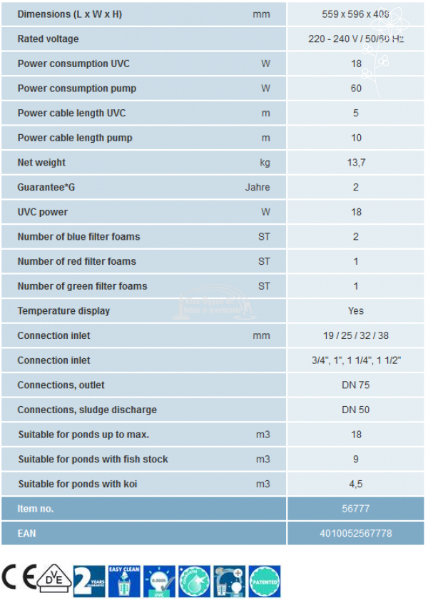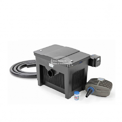Oase BioSmart Set 18000, átfolyós tószűrő szett 18W UV-C készülékkel, 5.300L/h szűrőtápláló szivattyúval. Átfolyós vagy más néven gravitációs szűrő szett, Oase BioSmart 18000 kerti tó szűrő, Vitronic 18W UV-C készülékkel, AquaMax Eco Classic 5500 - 5.300L/h teljesítményű szűrőtápláló szivattyúval, 5 fm 1 1/2"-os (6/4") tömlővel és csatlakozókkal, vízhőmérővel, vízszint kijelzővel, +  100 ml BioKick szűrőindító baktérium. Halasítás nélkül 18.000L-ig, halasítva 9-11.000L-ig függően a halak számától, koi-k esetében 4.500L-ig ajánlott.UV-C blokk lebegő algák ellen, szűrő filterek a fizikai szennyeződések ellen és a biológiai szűréshez.