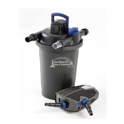 Oase FiltoClear Set 19000, nyomásszűrő szett, beépített 36W UV-C készülékkel, AquaMax Eco Premium 12000 -12.000L/h szivattyúval, csatlakozókkal, 100 ml indítóbaktérium kultúrával. A megtisztított vizet 1-1,5 m-es magasságig lehet felvezetni patak üzemeltetéséhez. Halasítás nélkül 20.000L-ig, halasítva 10-12.000L-ig a halmenyiség függvényében, koi-k esetén 5.000L-ig ajánlott. A szűrő tetején kivezetett kar segítségével szétszerelés nélkül könnyedén elvégezhető egy gyorstisztítás. A szennyezett víz kivezetésére külön kimenet szolgál, mely egy irányváltó csap segítségével könnyedén üzembe helyezhető. A biológiai szűrést a nitrifikáló baktériumok megtelepedését segítő műanyag labdacsok fokozzák. A szűrőház ~ 2/3-ig talajba temethető. Opcióként külön megvásárolható hozzá egy kő hatású fedőburkolat.