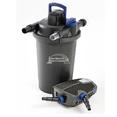 Oase FiltoClear Set 31000, nyomásszűrő szett, beépített 55W UV-C készülékkel, AquaMax Eco Premium 16000 -16.000L/h szivattyúval, csatlakozókkal, 100 ml indítóbaktérium kultúrával. A megtisztított vizet 1-1,5 m-es magasságig lehet felvezetni patak üzemeltetéséhez. Halasítás nélkül 30.000L-ig, halasítva 15-18.000L-ig a halmenyiség függvényében, koi-k esetén 8.000L-ig ajánlott. A szűrő tetején kivezetett kar segítségével szétszerelés nélkül könnyedén elvégezhető egy gyorstisztítás. A szennyezett víz kivezetésére külön kimenet szolgál, mely egy irányváltó csap segítségével könnyedén üzembe helyezhető. A biológiai szűrést a nitrifikáló baktériumok megtelepedését segítő műanyag labdacsok fokozzák. A szűrőház ~ 2/3-ig talajba temethető. Opcióként külön megvásárolható hozzá egy kő hatású fedőburkolat.