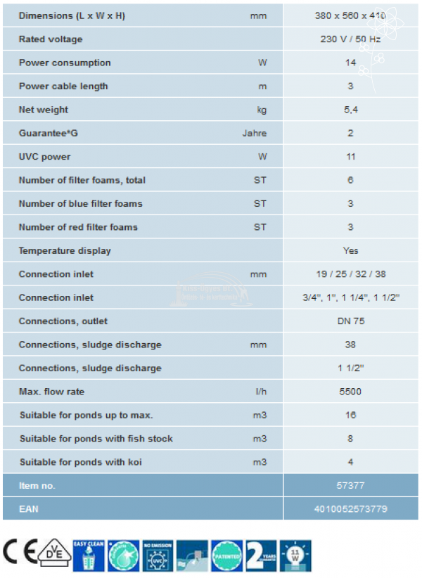 Oase BioSmart UVC 16000 átfolyós szűrő, 11W UVC készülékkel, vízhőmérővel, vízszint kijelzővel, oxigénnel dúsító speciális csatornával, csatlakozókkal, maximális áteresztő képesség 5.500L/h. Halasítás nélkül 16.000L-es, halasítva ~ 9-10.000L-es tavakig ajánlott, halmennyiség függvényében. UV-C blokk lebegő algák ellen, szűrő filterek a fizikai szennyeződések ellen és a biológiai szűréshez.