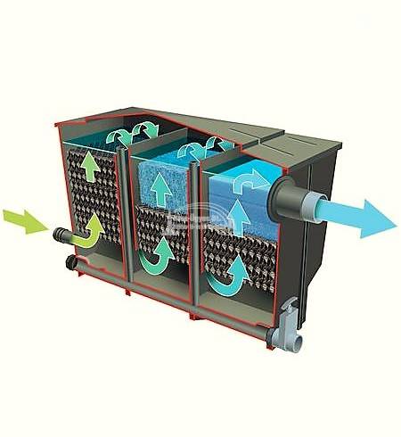Ubbink BioClear 30000, 3 kamrás átfolyós szűrő, maximum 30 m3-es halasítás nélküli és 19 m3 halasított tavakig ajánlott.