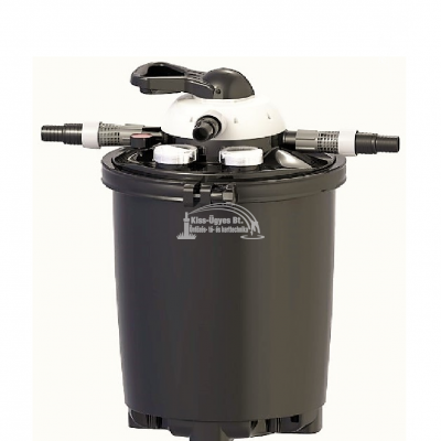 Velda Clear Control 50 nyomásszűrő, 18W beépített UV-C készülékkel, csatlakozókkal. UV-C blokk lebegő algák ellen, szűrő filterek a fizikai szennyeződések ellen, aktív szén a kémiai anyagok ellen, lávakő a biológiai szűréshez. Üzemi nyomás 1,5 bar, a megtisztított vizet 1 m-es magasságig lehet felvezetni patak üzemeltetéséhez. Halasítás nélkül 20.000L-ig, halasítva 10-12.000L-ig a halmenyiség függvényében, koi-k esetén 5.000L-ig ajánlott. A szűrő tetején lévő, 7 fokozatba forgatható karral lehet beállítani a szűrő funkcióit, pl: 1. visszamosatás, 2. szűrés nélküli keringetés 3. kimosatás 4. szűrés 5. leállítás tisztításhoz (először a szivattyút kell leállítani) 6. gyógyszeres kezelés 7. téli leállás. 2 év garancia. Opcióként felszerelhető 300W-os fűtőkészülékkel.