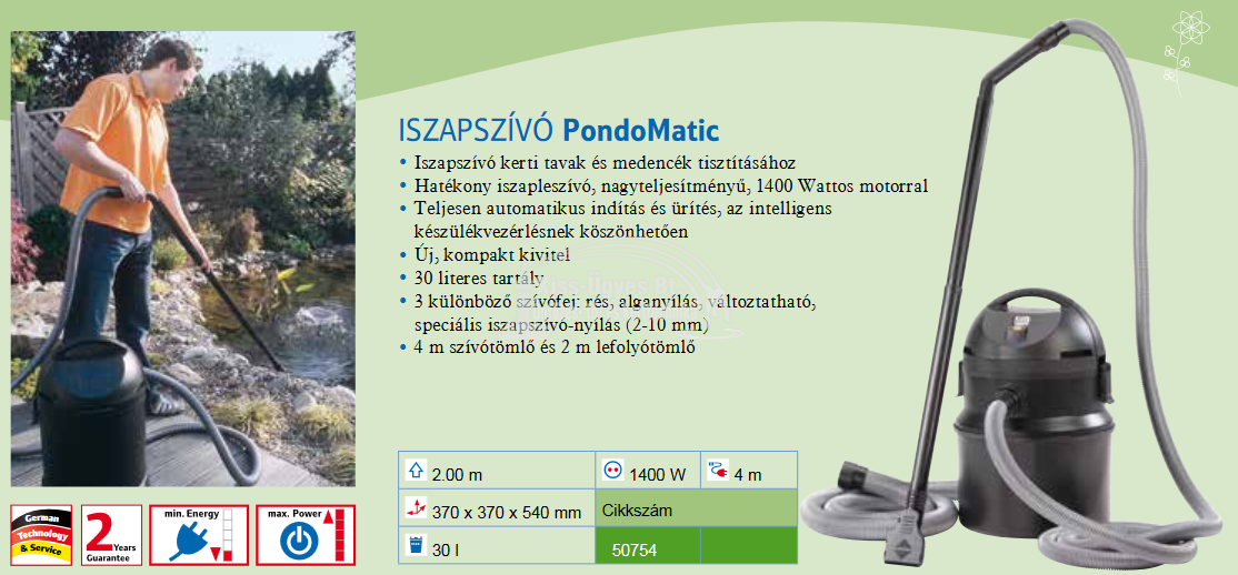 Pontec PondoMatic iszapszívó, 30L kapacitású tároló, 1.400W teljesítmény. Autómatikus szennyezettvíz ürítés. Kisebb tavakhoz, medencékhez ajánlott. Tartozékok: 4, m szívó gégecső, 2 m nyomó gégecső, 2 részes 1,8 m merev szívószár és 3 különböző szívófej: rés, alganyílás, változtatható, speciális iszapszívó nyílás 2-10mm.