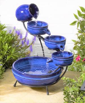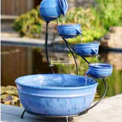 Ubbink Ceramic Well dekorációs szett, kék színű kerámia edények, a felső kancsó és a kis tálkák átmérője 14 cm, az alsó nagy tál átmérője 45 cm, magassága 15 cm, a szett méretei: magasság 60 cm, szélessége 51 x 51 cm. A hozzá tartozó vízpumpa 350 L/h. A tartószerkezet fém. Mutatós lehet kissebb kertrészben, teraszon, medence mellett, vagy beltérben.