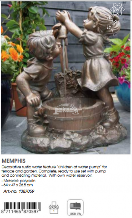 Ubbink Memphis dekorációs szett, bronzszobor hatású, szivattyú 350L/h, vízbekötő cső, saját víztartály. Mérete: 64 x 47 x 26,5 cm.