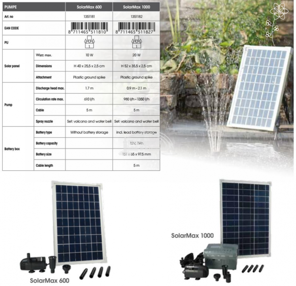 Ubbink SolarMax 1000 napelemes szökőkút + akkumlátorral, 980-1350L/h, 2 fúvókával (2 év garancia)