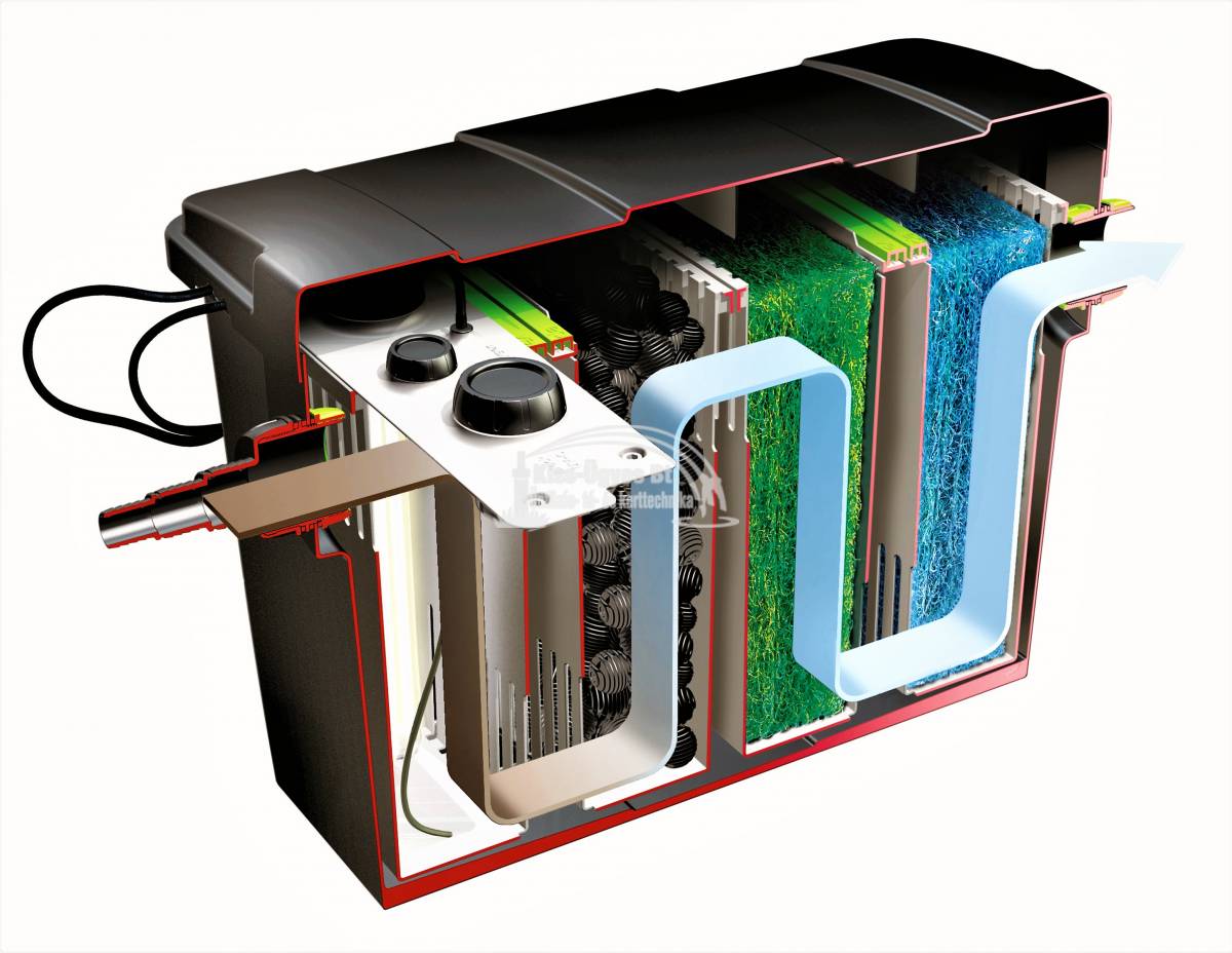 Velda Giant Biofill XL átfolyós vagy más néven gravitációs szűrő 18W-os UV-C készülékkel lebegő algák ellen. Halasítás nélkül 20.000L-es, halasítva ~ 10-12.000L-es tavakig ajánlott, halmennyiség függvényében. Négy kamrás szűrő: UV-C blokk lebegő algák ellen, Szűrő filterek a fizikai szennyeződések ellen, aktív szén a kémiai anyagok ellen, műanyag labdácskák a biológiai szűréshez.