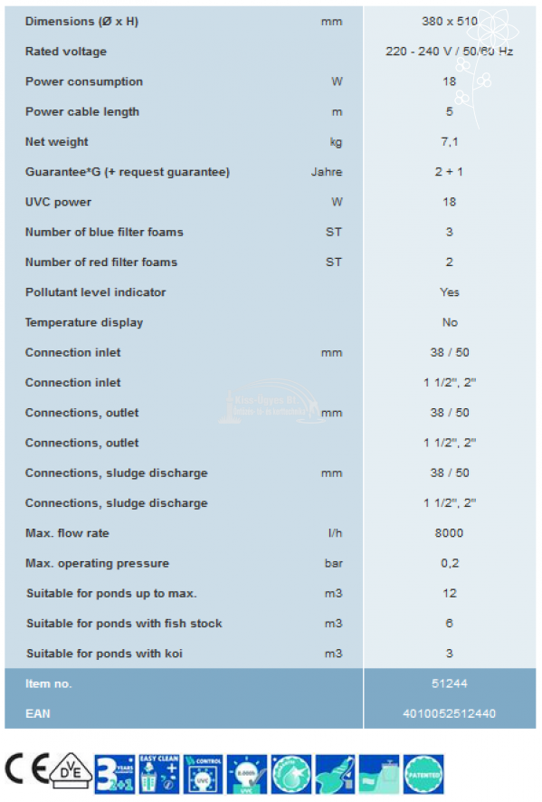 Oase FiltoClear 13000 nyomásszűrő, beépített 18W UV-C készülékkel, csatlakozókkal. Maximális áteresztő képesség 8.000L/h. A megtisztított vizet 1-1,5 m-es magasságig lehet felvezetni patak üzemeltetéséhez. Halasítás nélkül 12.000L-ig, halasítva 6-7.000L-ig a halmenyiség függvényében ajánlott. A szűrő tetején kivezetett kar segítségével szétszerelés nélkül könnyedén elvégezhető egy gyorstisztítás. A szennyezett víz kivezetésére külön kimenet szolgál, mely egy irányváltó csap segítségével könnyedén üzembe helyezhető. UV-C blokk lebegő algák ellen, szűrő filterek a fizikai szennyeződések ellen, a biológiai szűrést a nitrifikáló baktériumok megtelepedését segítő műanyag labdacsok fokozzák. A szűrőház ~ 2/3-ig talajba temethető. Opcióként külön megvásárolható hozzá egy kő hatású fedőburkolat.