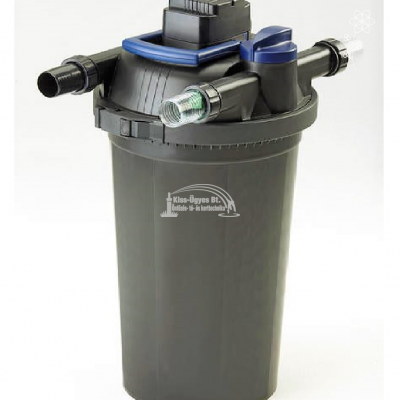Oase FiltoClear 31000 nyomásszűrő, beépített 55W UV-C készülékkel, csatlakozókkal. Maximális áteresztő képesség 12.000L/h. A megtisztított vizet 1-1,5 m-es magasságig lehet felvezetni patak üzemeltetéséhez. Halasítás nélkül 30.000L-ig, halasítva 15-18.000L-ig a halmenyiség függvényében, koi-k esetén 7.000L-ig ajánlott. A szűrő tetején kivezetett kar segítségével szétszerelés nélkül könnyedén elvégezhető egy gyorstisztítás. A szennyezett víz kivezetésére külön kimenet szolgál, mely egy irányváltó csap segítségével könnyedén üzembe helyezhető. UV-C blokk lebegő algák ellen, szűrő filterek a fizikai szennyeződések ellen, a biológiai szűrést a nitrifikáló baktériumok megtelepedését segítő műanyag labdacsok fokozzák. A szűrőház ~ 2/3-ig talajba temethető. Opcióként külön megvásárolható hozzá egy kő hatású fedőburkolat.