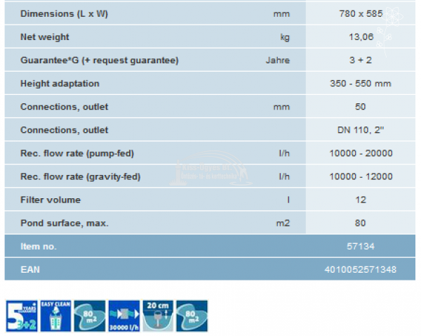 Oase ProfiSkim 100, fix telepítésű vízfelület tisztító és levélszűrő, gravitációs és szivattyú táplált rendszerekhez egyaránt alkalmas. Gravitációs rendszerben a minimális kapacitás 10.000L/h, a maximális kapacitás 12.000L/h, szivattyú táplált rendszerben a minimális kapacitás 10.000L/h, a maximális kapacitás 20.000L/h. Maximálisan 65-80 m2 vízfelszín tisztítására alkalmas. Szűrőkosár kapacitás 12L. A szűrőkosár vízszint ingadozás tűrésének mértéke 20 cm, 35 és 55 cm vízszintmagasság között. Kimeneti csatlakozása DN110 a gravitációs rendszerekhez igazodva, vagy egy tartozék átalakítóval DN50 ill. 2" a szivattyús rendszerekhez.