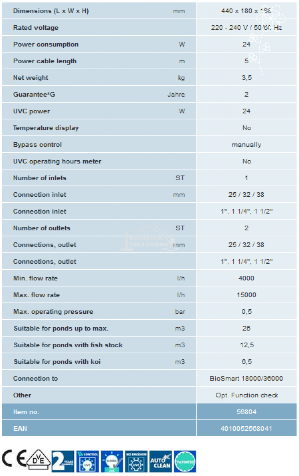 Oase Bitron 24 W, UV-C algaleválasztó előszűrő készülék lebegő algák ellen. Minimális áteresztő képessége 4.000L/h, maximális áteresztő képessége 6.000L/h. Halasítás nélkül 25 m3-ig, halasítva 13 m3-ig, koi-k esetén 7 m3-ig ajánlott. A készülék egy mikrokapcsolós gyorskioldó segítségével könnyen szétszedhető és összeilleszthető tisztítás alkalmával. Található rajta egy ellenőrző ablak, melyen keresztül biztonságosan ellenőrizhető az UV fénycső működése. Két kis kar segítségével lehet szabályozni az átfolyó víz útját. A fénycsövet védő kvarcüveg búrát egy szabadalmaztatott, vízáram segítségével forgatott tisztító egység védi a lerakódásoktól. A vízkőlerakódás ellen egy beépített mágnes is véd. A készülék a következő Oase termékekkel kompatibilis, oly módon, hogy előre elkészített  csatlakozásuk van kialakítva ezen típus számára: BioSmart 18000/36000.