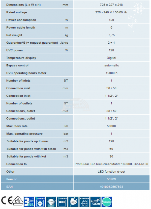 Oase Bitron Eco 120 W, UV-C algaleválasztó előszűrő készülék lebegő algák ellen. Maximális áteresztő képessége 50.000L/h. Halasítás nélkül 120 m3-ig, halasítva 60 m3-ig, koi-k esetén 30 m3-ig ajánlott. A készülék egy mikrokapcsolós gyorskioldó segítségével könnyen szétszedhető és összeilleszthető tisztítás alkalmával. Digitális vezérlőn keresztül ellenőrizhető az UV fénycső működése, állapota. Egy membrán segítségével lehet szabályozni az átfolyó víz útját, a szűrőrendszer adottságainak megfelelően. Új, egyedülálló, a Philips cég által kifejlesztett fénycsövekkel van felszerelve, melyek akár 50%-al csökkenthetik az energiafelhasználást, mely évi ~ 525 kg-al csökkenti a szén-dioxid kibocsátást és emellett élettartama jelentősen hosszabb, ~ 12.000 óra. A fénycsövet védő kvarcüveg búrát egy szabadalmaztatott, vízáram segítségével forgatott tisztító egység védi a lerakódásoktól. A vízkőlerakódás ellen egy beépített mágnes is véd. A megnövelt készülékház nagyobb vízmennyiség befogadására képes, növelve a hatékonyságot. A készülék a következő Oase termékekkel kompatibilis, oly módon, hogy előre elkészített  csatlakozásuk van kialakítva ezen típus számára: ProfiClear, BioTec ScreenMatic² 140000, BioTec 30.