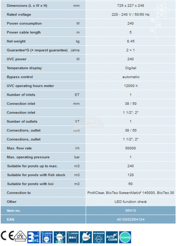 Oase Bitron Eco 240 W, UV-C algaleválasztó előszűrő készülék lebegő algák ellen. Maximális áteresztő képessége 50.000L/h. Halasítás nélkül 240 m3-ig, halasítva 120 m3-ig, koi-k esetén 60 m3-ig ajánlott. A készülék egy mikrokapcsolós gyorskioldó segítségével könnyen szétszedhető és összeilleszthető tisztítás alkalmával. Digitális vezérlőn keresztül ellenőrizhető az UV fénycső működése, állapota. Egy membrán segítségével lehet szabályozni az átfolyó víz útját, a szűrőrendszer adottságainak megfelelően. Új, egyedülálló, a Philips cég által kifejlesztett fénycsövekkel van felszerelve, melyek akár 50%-al csökkenthetik az energiafelhasználást, mely évi ~ 525 kg-al csökkenti a szén-dioxid kibocsátást és emellett élettartama jelentősen hosszabb, ~ 12.000 óra. A fénycsövet védő kvarcüveg búrát egy szabadalmaztatott, vízáram segítségével forgatott tisztító egység védi a lerakódásoktól. A vízkőlerakódás ellen egy beépített mágnes is véd. A megnövelt készülékház nagyobb vízmennyiség befogadására képes, növelve a hatékonyságot. A készülék a következő Oase termékekkel kompatibilis, oly módon, hogy előre elkészített  csatlakozásuk van kialakítva ezen típus számára: ProfiClear, BioTec ScreenMatic² 140000, BioTec 30.