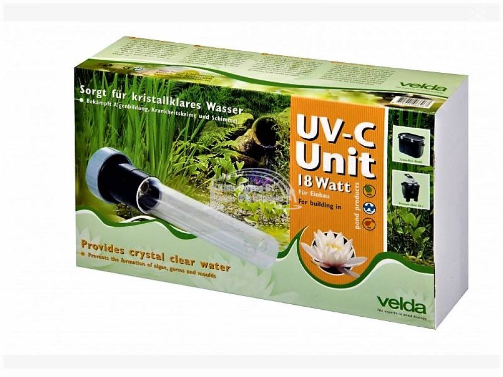 Velda UV-C Unit 18W algaleválasztó UV-C előszűrő, lebegő algák ellen. 18W teljesítménnyel, 20.000L-es tavakig ( halasítás nélkül ). A készülék a Velda átfolyós- ( Cross Flow Biofil, Giant Biofil XL ) és nyomásszűrőkkel ( Clear Controll 25-50-75 ) kompatibilis. Ez a típus a Cross Flow Biofil, a Clear Controll 50, és a Giant Biofil XL készülékekbe való. Az UV-C készülék, menetes kupakjának betekerésével egyszerűen csatlakoztatható a szűrők erre a célra kialakított fogadó részével. Tisztításkor ugyan ilyen könnyen kivehető, nem kell hozzá egy burkolatot eltávolítani, mint a többi gyártó esetében.