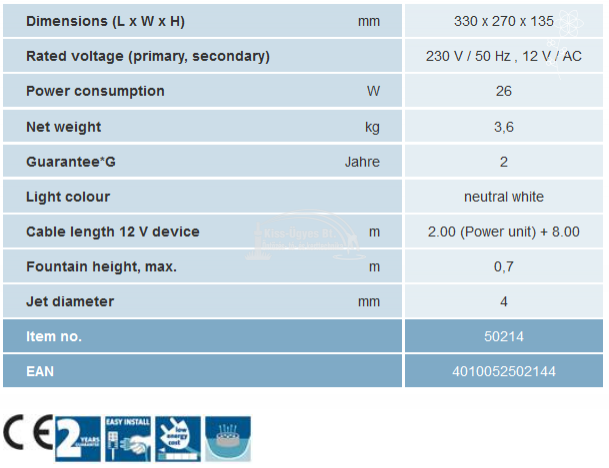 Oase Water Starlet úszó szökőkút színes LED-es világítással. Csatlakoztatásra kész komplett szett. A szett tartalma: 5 db vízsugaras fúvóka, darabonként 6 led világítással, 5 db szivattyú, transzformátor és kábel. A programok, fehér fény és a vízkép látvány elemei is körprogram szerint beállítható. A vízkép maximális magassága 0,7 m, képe tetszőlegesen beállítható a fúvókák döntésével. Szita rendszerű padlólap véd a szennyeződések általi eltömődéstől. Biztonságos, energiatakarékos 12 V technológia, úszótavakban is alkalmazható. Időzítőhöz is csatlakoztatható.