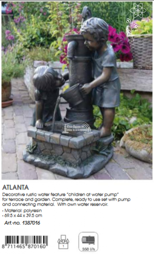 Ubbink Atlanta dekorációs szett, színezett, bronzos hatású, szivattyú 350L/h, vízbekötő cső, saját víztartály. Mérete: 69,5 x 44 x 39,5 cm.