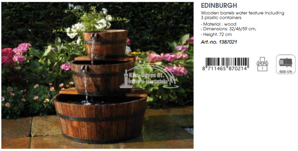 Ubbink Edinburg dekorációs szett, 3 fa dézsa, bennük 1-1 műanyag vízgyüjtő tartály, 600L/h szivattyú. Méretek: dézsák átmérői- 32/46/59 cm, teljes magasság: 72 cm.
