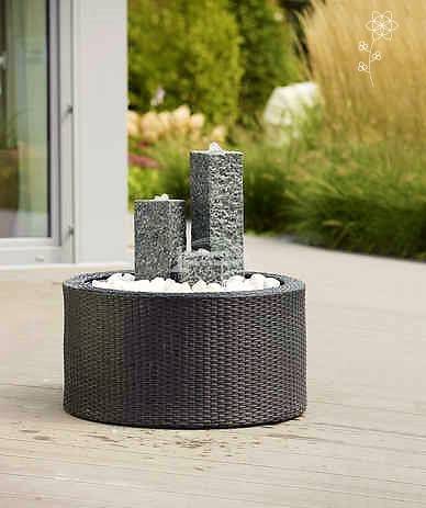Ubbink Siena dekorációs szett, 68 x 36 cm-es, 90L-es fedeles műanyag tartály, 1.600L/h szivattyú, 3 db antracit színű, gránitból kialakított négyzet alapú oszlop, közepükön LED világítással, 3-as osztóval, vízbekötő csővel. Az oszlopok mérete: 15 x 15 x 20/35/50 cm. Felszín feletti telepítéshez vásárolható hozzá Ubbink Decowall Wicker I. antracit színű, vagy Decowall Wicker VII. világosszürke rattan borítás.